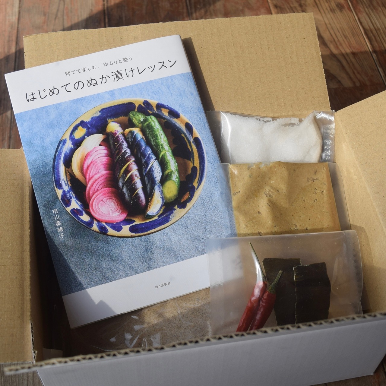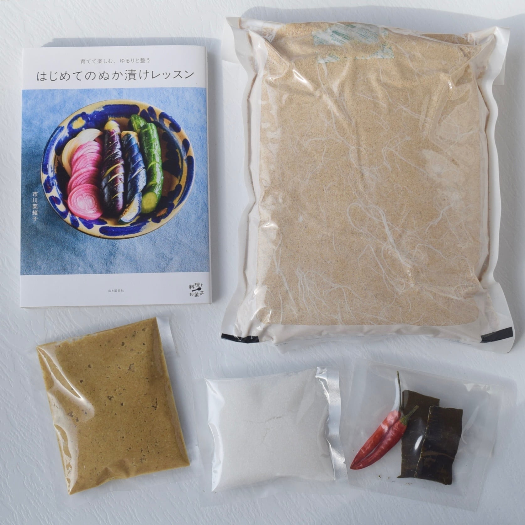無農薬自然栽培の米ぬか、天然塩、唐辛子、昆布、ぬかこの種、書籍「はじめてのぬか漬けレッスン(山と溪谷社)」がセットになった、ぬかこのぬか床スターターキットです。