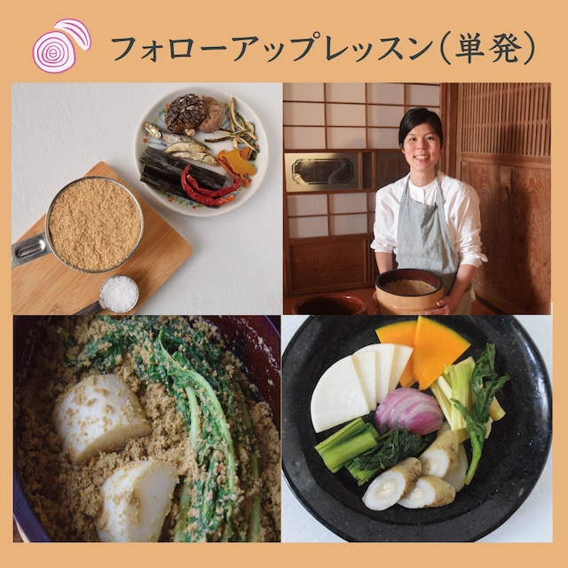 【3月18日(水) 12:00 受付開始】 糠漬けアーティスト・市川菜緒子が3ヶ月間あなたの「ぬか生活」に伴走します。 「失敗したくない」「一生続けられる習慣にしたい」という方に、一番おすすめのフルサポートコースです。 著書『はじめてのぬか漬けレッスン』付き。 (購入者さまのお名前と、メッセージ、直筆のサインをおつけします。) 【コース限定特典】 (1)LINEでの個別ぬか床診断 レッスン前後の3ヶ月間、不安な時に直接LINEで相談いただけます。 (2)「ぬか床ミニセット」を同梱 第1回の発送時に、厳選した「赤唐辛子&昆布&ぬかこの香りおやつ」をお付けします。 <内容・日時> 定員10名限定の双方向オンラインレッスン(各回90分)です。 第1回目までに、私が厳選した新鮮な「生ぬか」とサイン入り著書をお届けします。 第1回:4月16日(木) 20:00-21:30「ぬか床デビュー編」 届いた生ぬかで、一緒に基本のぬか床を仕込みます。 第2回:5月14日(木) 20:00-21:30「ぬか床健康診断編」 仕込みから1ヶ月。第一回で仕込んだぬか床を画面越しにチェックさせていただきます。参加者同士でお悩み共有・解決、個別にアドバイスを行います。 第3回:7月16日(木) 20:00-21:30「夏越しサバイバル編」 仕込みから3ヶ月。一番の難所「夏」を乗り切り、一生モノの習慣にします。 <形式> オンライン(Zoom) 定員10名 <お届けするもの(第1回前)> ・新鮮な生ぬか(1kg) ・著書『はじめてのぬか漬けレッスン(山と溪谷社)』(サイン入り) ぬか床の基本情報、ぬか床に必要な材料、アレンジレシピ、Q&Aが掲載されております。 こちらを見ながら、ぬか床づくりを行なっていただきます。 ※送料・事務手数料込 ※第一回目の2週間前までには発送します。 <すでに著書をお持ちの方・2冊目が不要な方へ> 備考欄に「本を所持」とご記入ください。書籍の代わりに「足しぬか用・生ぬか1kg」を同梱いたします。 <注意点> ・容器、プレ漬け用のキャベツの外葉、米ぬか以外の材料はご自身でご用意ください。詳細は申込後にご連絡します。 ・購入者限定LINEサポート付きだから安心です。